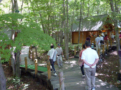 Ningle Terrace (ニングルテラス) has been created using natural materials with timber buildings and plank walkways around the waterfalls and trees.